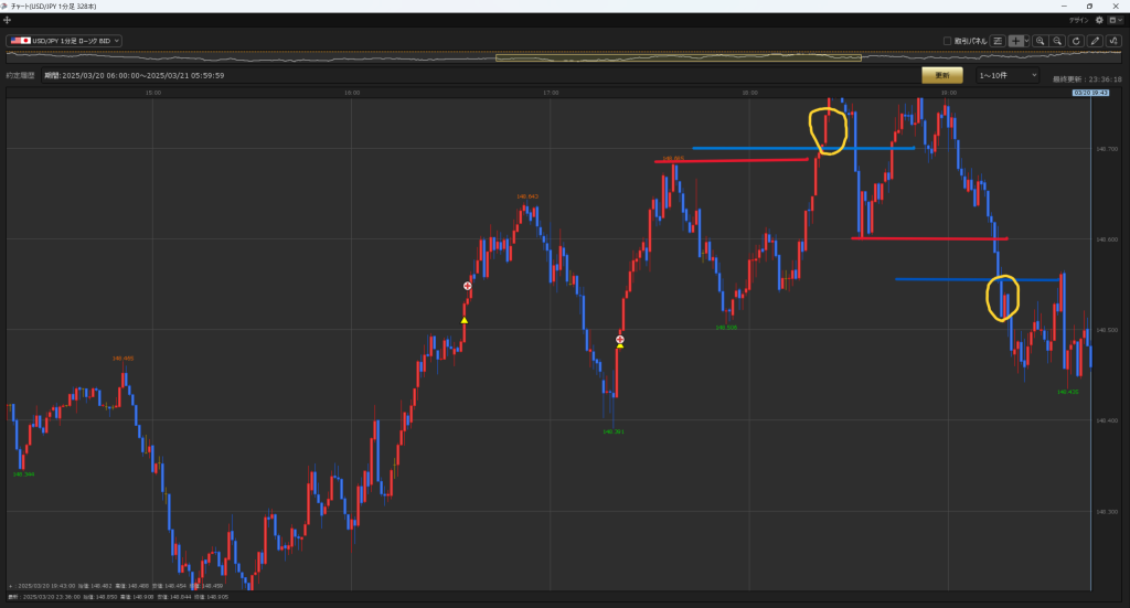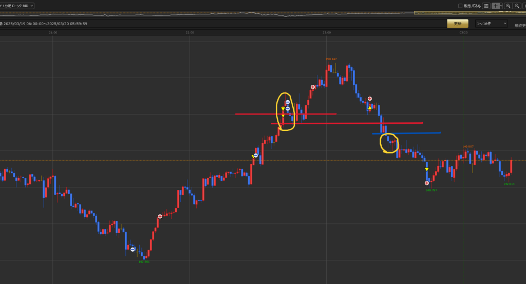 逆張りは取れてはいるが、狙うは損切を巻き込む黄色丸の動き