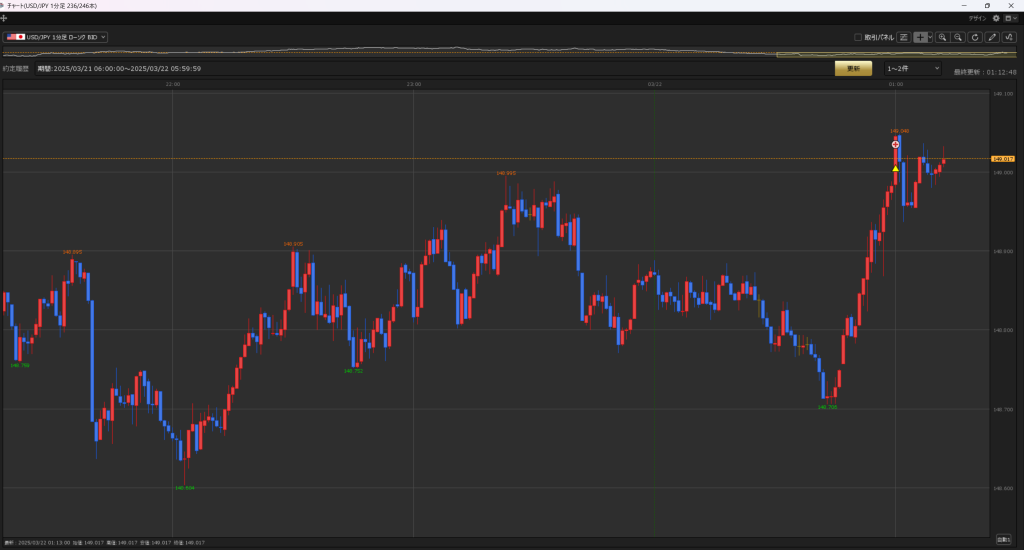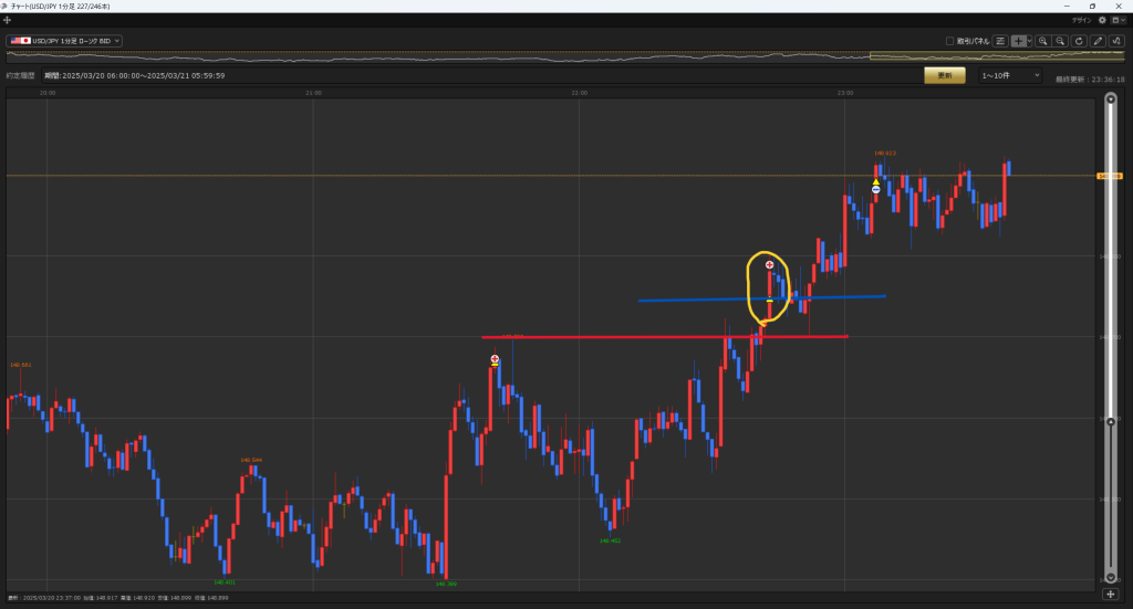 149にタッチした瞬間、損切を巻き込んで上昇する動き
