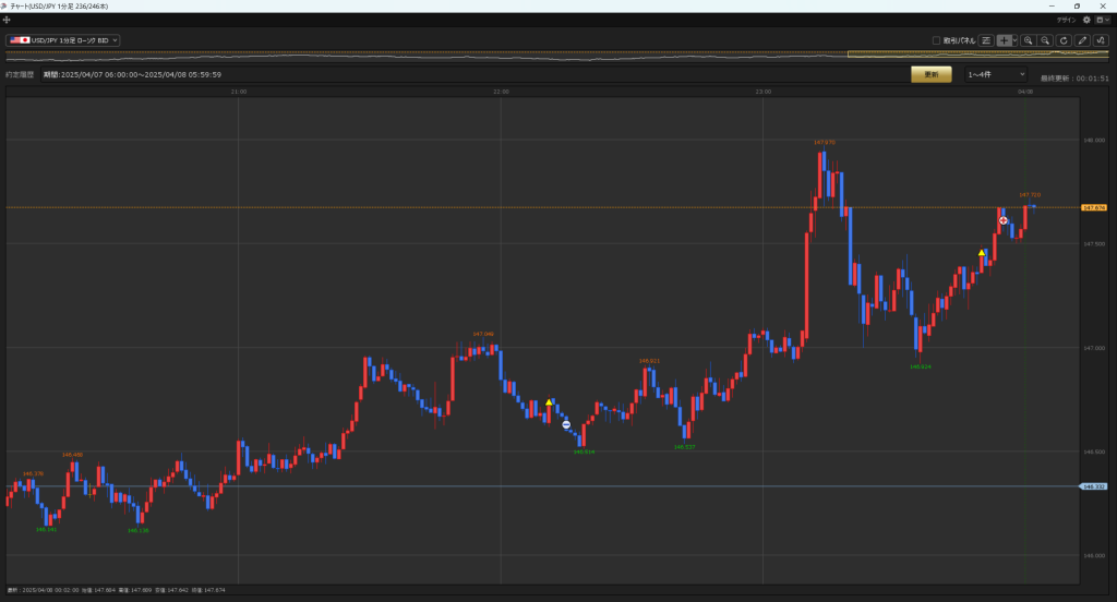 途中フェイクニュースなどで、5分間で1円動いたり、なかなか荒い一日だった